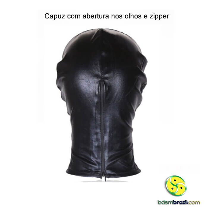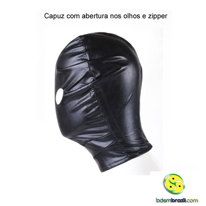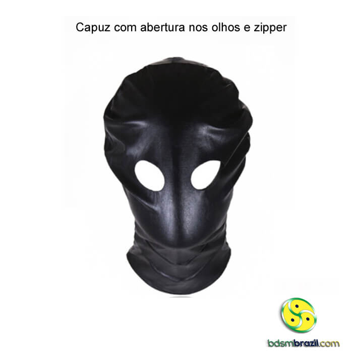 Capuz com abertura na região dos olhos e fechamento com zíper traseiro.