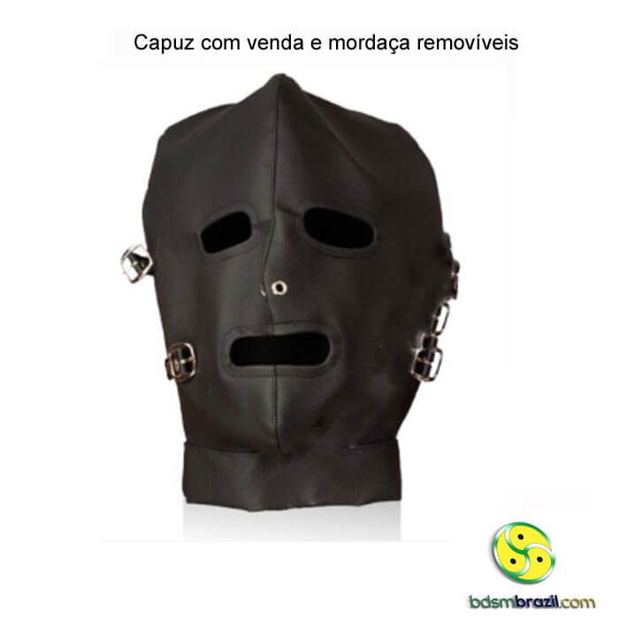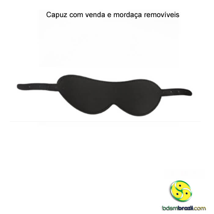 Capuz com venda e mordaça removíveis.