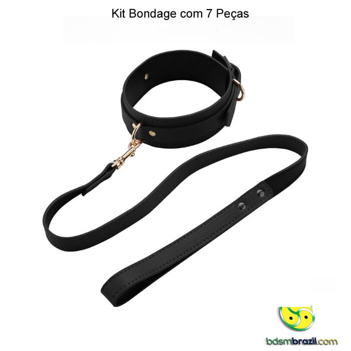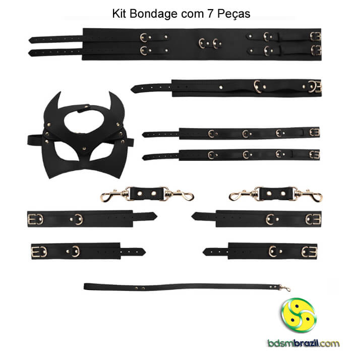 O Kit inclui uma variedade de peças essenciais, como um par de algemas para prender os pulsos, um par de tornozeleiras para restringir os movimentos, um cinturão com grilhões para uma imersão completa na submissão, um par de perneiras para explorar novas formas de entrega, uma máscara com rebites para ocultar a identidade e intensificar os sentidos, uma coleira para simbolizar a submissão e uma guia com puxador e corrente para guiar e controlar com elegância e autoridade.