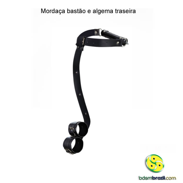A combinação da mordaça bastão com a algema traseira oferece imobilização facial e corporal ao mesmo tempo, intensificando a entrega ao jogo de dominação.
